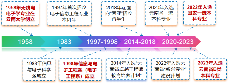 信息与电子工程系成立于1998年,最早可追溯于1958年创建的云南大学无线电电子学专业和1983年成立的信电系,主要承担电子信息工程专业的本科教学与管理工作。该专业于1997年起招收本科生,2014年获批云南省“卓越工程师教育培养计划”,2018年起面向“两亚”招收留学生,2020年入选省级一流专业建设计划,2022年入选国家一流专业和云南省新兴专业建设计划,2023年顺利升入云南省B类本科专业,已成为云南省建设时间最早、培养体系最完备、综合实力最强的电子信息工程专业人才培养基地。