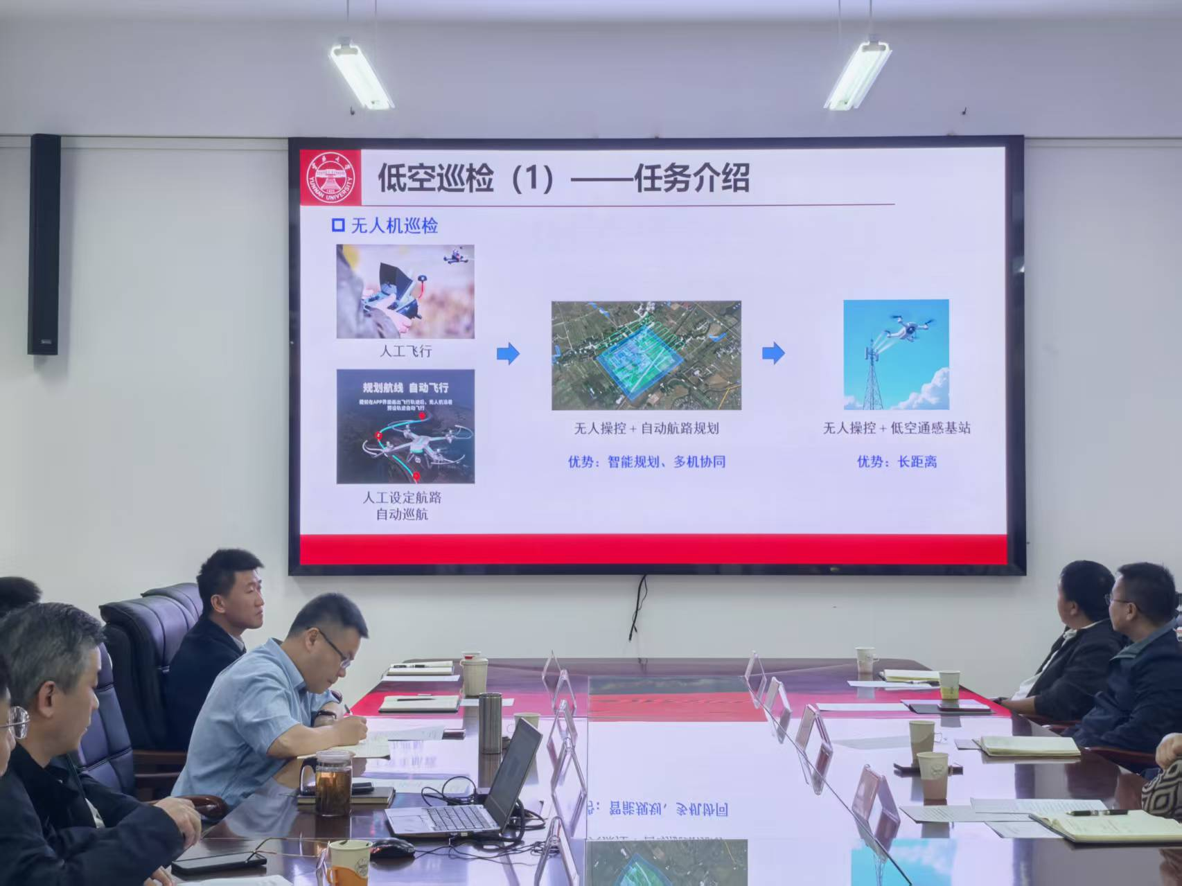 信息学院副院长刘夕龙围绕专业设置与人才培养体系,学科、学位点与科研平台建设,介绍了信息学院的整体发展情况。在此基础上,学院低空技术团队展示了基于智能体与强化学习等技术的低空智能巡检研发进展,重点介绍了团队在校园治理、农林植保等方面的探索成果,相关技术在典型场景中的应用路径和实现方式得到初步验证。副院长武浩从有组织科研、前沿技术布局、重大项目培育及产业合作机制等方面,介绍了云南大学低空技术研究院建设情况。他表示,研究院将以服务产业需求为导向,整合多方资源与科技力量,强化科研工作的有组织化推进,持续提升关键技术攻关能力与成果转化水平,为云南低空产业发展提供有力支撑。